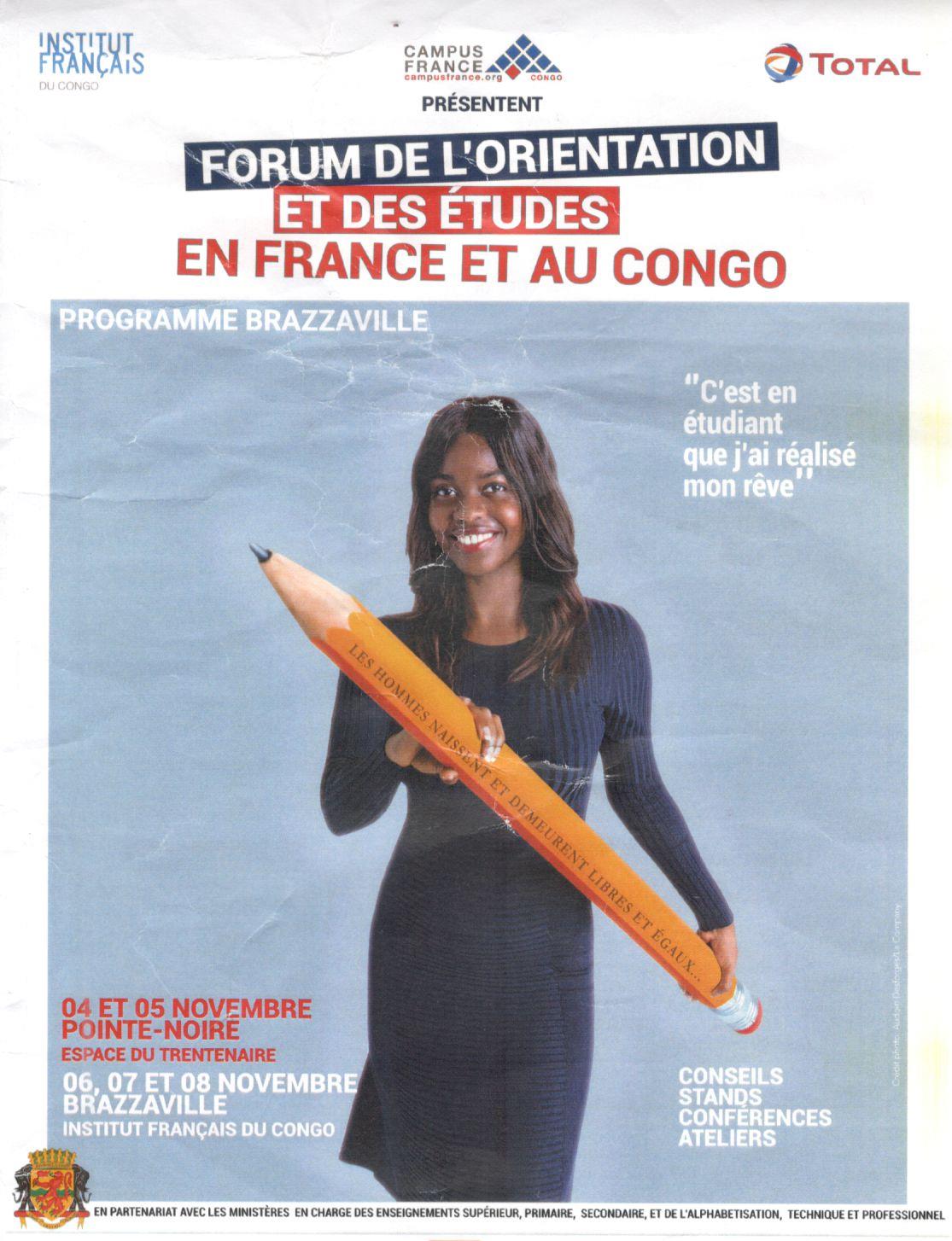 Le forum de l'orientation et des études en France et au Congo débute le 6 novembre, sur le thème « C’est en étudiant que j’ai réalisé mon rêve ». Au programme, des conférences, présentations de filières, ateliers d’orientation, en présence d'établissements d'enseignement supérieur français et congolais ainsi que de nombreuses entreprises et organisations non gouvernementales (ONG).