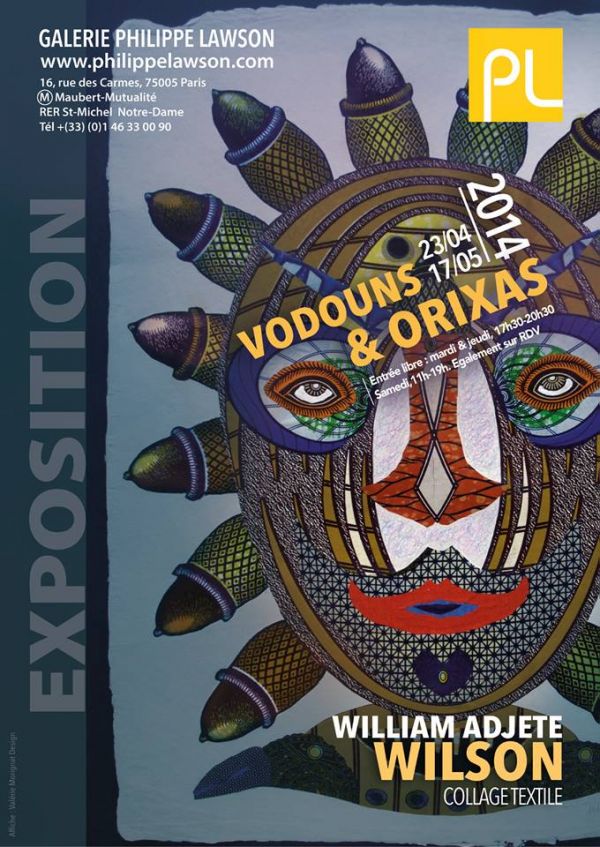 Paris. Exposition : Vodouns & Orixas, exposition de William Adjété Wilson. Le peintre plasticien franco-togolais William Adjété Wilson expose son travail sur le panthéon Vodoun à la galerie Philippe-Lawson dans le cinquième arrondissement de Paris du 23 avril au 17 mai, 16 rue des Carmes, Paris V. Un univers cosmogonique unique inspiré par les divinités vodou des deux côtés de l'Atlantique. Information sur Artistescontemporains.org/expositions/evenement.php?id=10060.