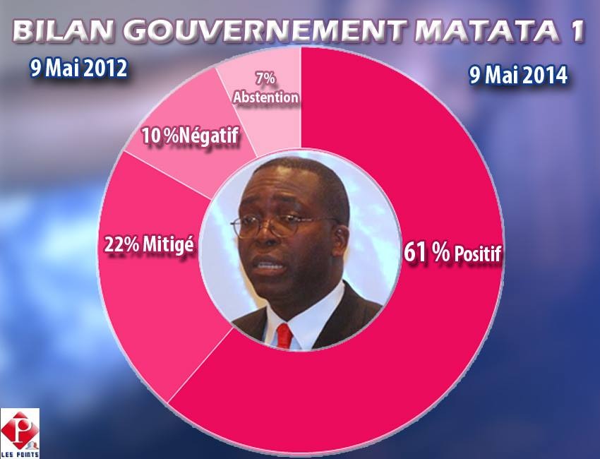 09 mai 2012- 09 mai 2014. À quelques heures du gong de deux ans d’entrée aux affaires du gouvernement Matata Ponyo, l’institut de sondage Les Points a publié le rapport d’une enquête sur le bilan de l’exécutif national. À l’issue de l’enquête par sondage réalisée du 5 au 6 mai, couplée avec la courbe d’évolution des cotes sur l’action du Premier ministre, il se dégage une cote moyenne de 61% d’opinions favorables à Matata Ponyo pour l’ensemble des réalisations enregistrées depuis mai 2012.