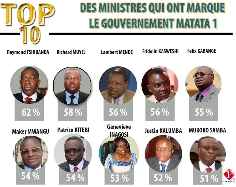 Dans le top 10 des ministres ayant marqué l’action du gouvernement pendant les deux ans figure en première position Raymond Tshibanda qui se maintient malgré la situation de crise diplomatique qui a surpris la RDC suite à l’expulsion massive des Congolais résidant au Congo Brazzaville. Il totalise une moyenne de cote de 62% de bilan positif sur les deux ans. Pas aisé d’occuper le siège du ministre de l’Intérieur dans un pays en plein conflit armé. Le ministre de l’Intérieur, Décentralisation et Affaires coutumières, Richard Muyej, en paie les frais. Crédité de 58% d’opinions favorables, il fait face à la petite et grande criminalité, conflit de pouvoir coutumier, une décentralisation mal comprise et contestée. Les enquêtés lui reconnaissent d’avoir relevé avec tact le défi sécuritaire de tous les grands rendez-vous nationaux et internationaux. Pour les Kinois, il partage le succès de l’opération ayant permis à la capitale d’être débarrassée des jeunes délinquants surnommés Kuluna. Il se pointe depuis plus de trois mois à la deuxième marche du gouvernement.