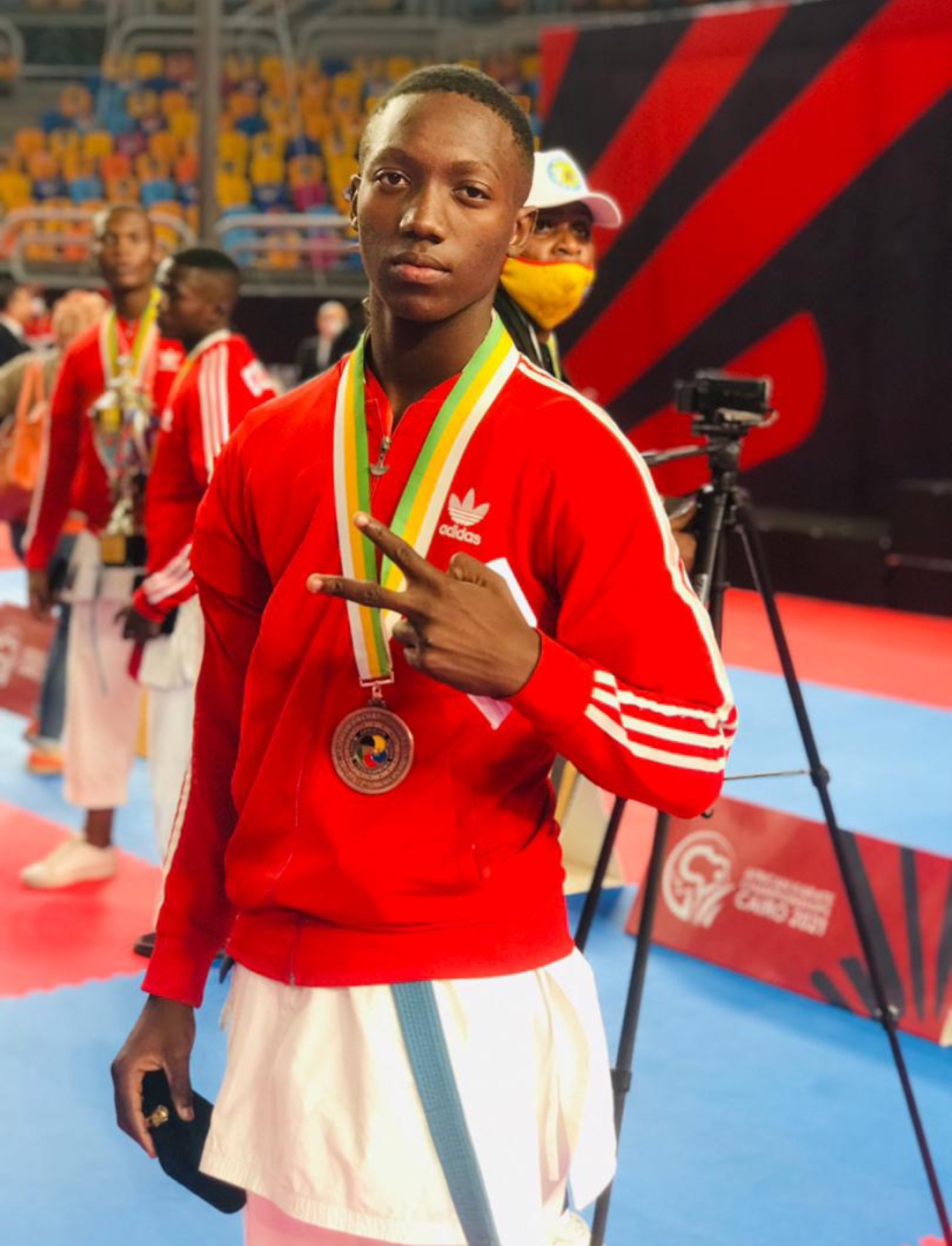 « J’ai commencé le karaté à l’âge de 9 ans et le football à environ 5 ans. Au karaté, c’est au club Académie que je suis formé. Mon rêve, en tant qu’athlète, consiste à marquer positivement les esprits. Au niveau du football, je n'ai pas encore reçu de récompense, par contre au karaté, j’ai eu à remporter plusieurs médailles en or, en argent et en bronze, notamment en kata comme en Kumité à l’échelle nationale. Le plus important à retenir est que j’ai participé à deux championnats d’Afrique, à Tanger (Maroc) en 2020, catégorie cadet Kumité -57kg où j’ai fini 2e, et au Caire (Égypte) en 2021, catégorie junior Kumité -76kg. J’avais occupé la 3e place et une autre 3e place en équipe Kata junior. J’ai également participé au championnat d’Afrique centrale zone 4 2021, à N’Djamena (Tchad), et j’ai fini 1er dans la catégorie junior Kumité -76kg», indique-t-il.
