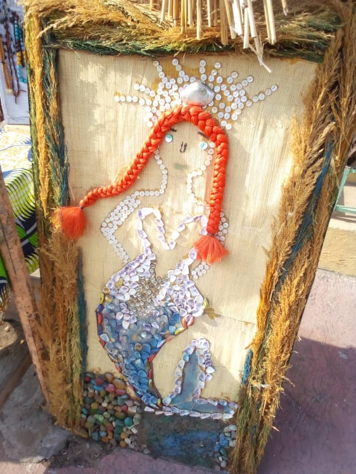 Parlant toujours de ses tableaux, notamment sur celui de la noix de coco, Alfred Monique Ondzé a remarqué que lorsque les gens prennent le lait de la noix de coco, ils jettent les coques. D’autres les jettent même dans l’eau, ce qui n’est pas du tout bien. Pour elle, on devrait plutôt avoir l’amabilité de recycler ces noix de coco et faire de beaux objets. Ce tableau de noix de coco, elle l’a intitulé “ Le cri de la nature”, parce que c’est une tête en forme de noix de coco qui pleure et qui a des larmes de sang. Elle pleure tout simplement parce que la nature n’est pas respectée, pour la simple raison que l’on jette des objets un peu partout dans l’eau. Alors que quand on jette certains objets dans l’eau, on pollue l’eau et on favorise la disparition de certaines créatures qui y vivent.