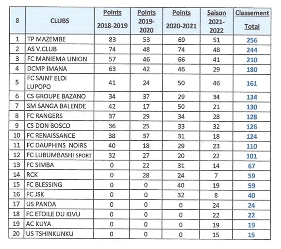 En tenant compte des résultats sportifs des clubs pour une période récente et représentative, à savoir les trois dernières autres saisons complétement jouées et validées, le Conor a donc établi un classement de la saison 2022-2023. « Le classement à prendre en compte pour la Linafoot Ligue 1 pour la saison 2022-2023 est le résultat des points cumulés des quatre saisons validées, à savoir les saisons 2018-2019, 2019-2020, 2020-2021 et 2021-2022 », indique l’article 2 de la décision du Conor prise à ce sujet.