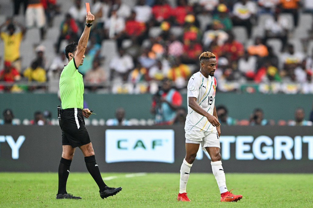 Initialement sanction d’un jaune, le capitaine du Syli a écopé en rouge après visionnage de la VAR par l'arbitre libyen Ibrahim Mutaz (45e+3).