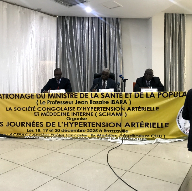 Le directeur du cabinet du ministre de la santé et de la population, Donacien Moukassa et le président de la Société Congolaise de l’hypertension Artérielle et maladies internes (SCHAMI), le professeur Bertrand Elenga Mbolla ont co-présidé, le18 décembre à Brazzaville, les travaux scientifiques des journées dédiées à la réflexion sur l’hypertension artérielle dont 25 à 26% de la population congolaise souffre de cette maladie.