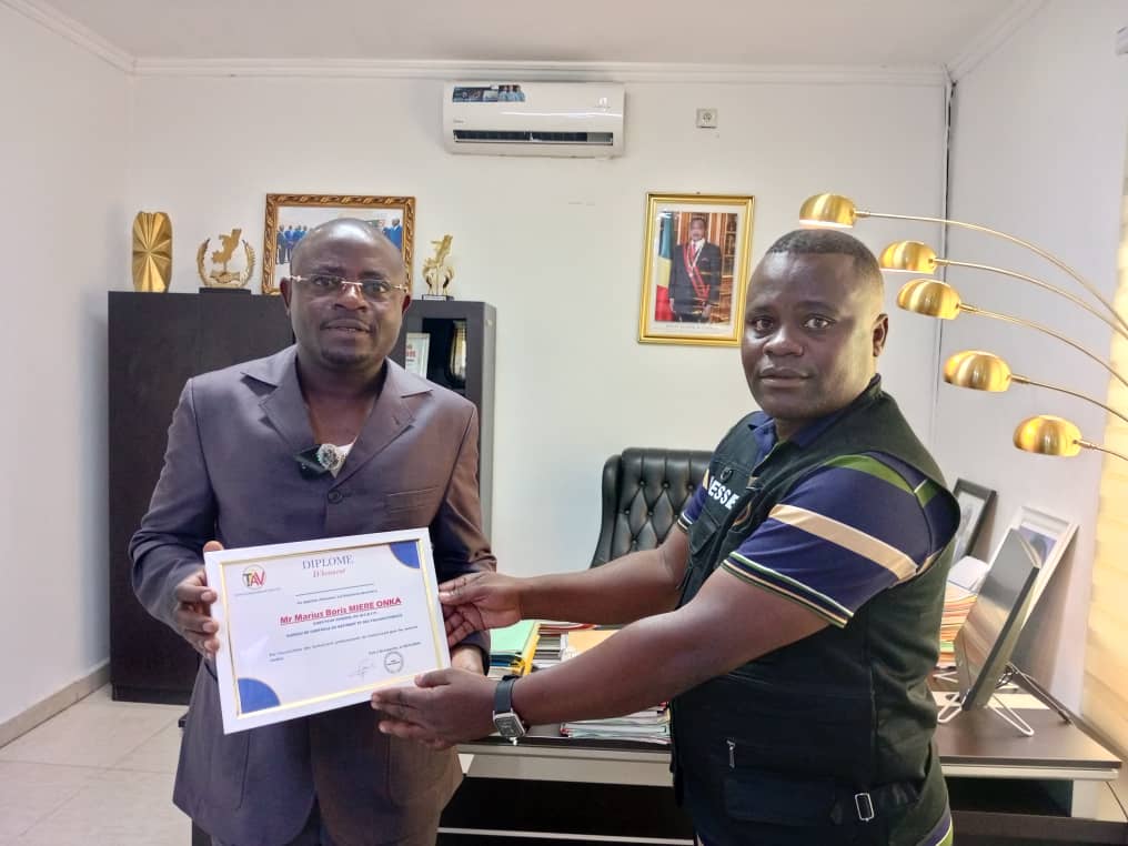 Le promoteur de la chaîne de télévision en ligne « TPAV média », Sax Bienvenu Gampio, a récemment remis au directeur général du Bureau de contrôle, du bâtiment et des travaux publics (BCBTP), Marius Boris Mieré Onka, un diplôme d’honneur en guise d’encouragement aux actions que cet ingénieur en travaux publics mène depuis son arrivée en mai 2022.
