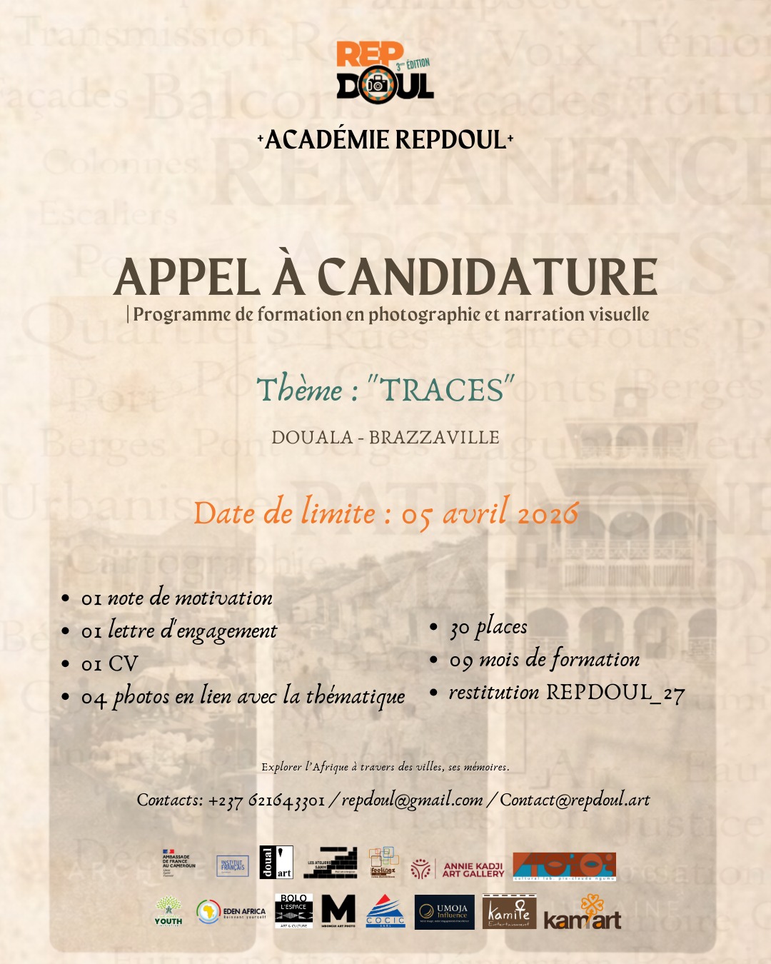 L'Académie des rencontres photographiques de Douala (Repdoul), au Cameroun, invite les photographes à s’inscrire à la 3e édition de la formation sur la photographie d’auteur qu’elle organise sur le thème « Traces ». Les inscriptions ont commencé le 9 février et se clôturent le 5 avril.