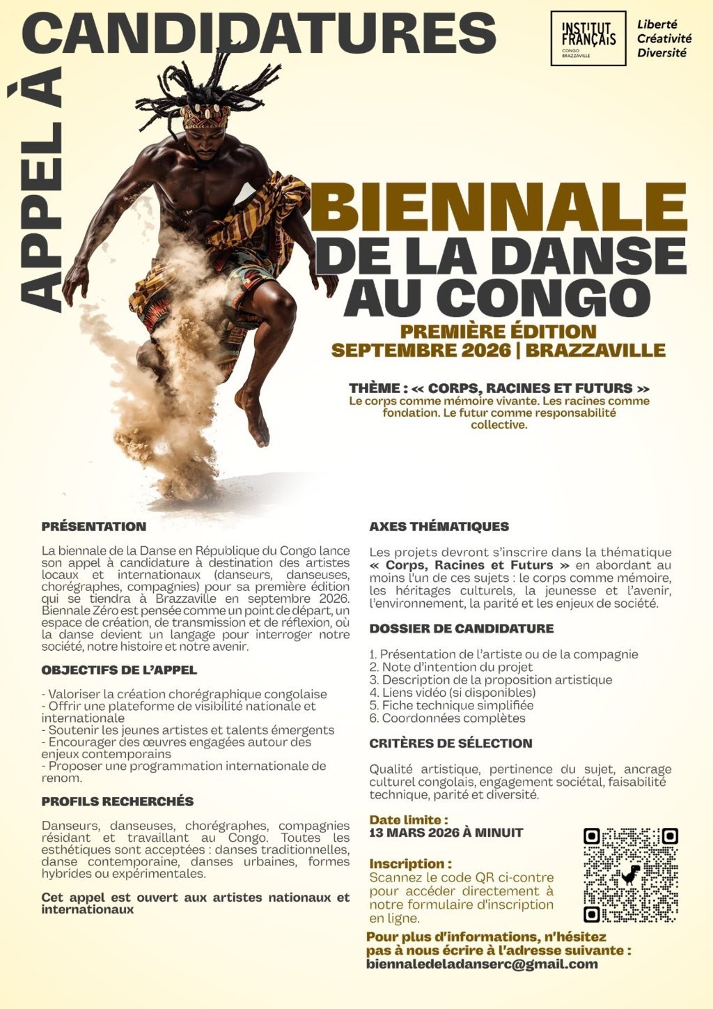 La biennale de la danse au Congo, nommée « Biennale zéro », lance un appel à candidature aux artistes nationaux et internationaux, résidant et travaillant en République du Congo, à soumettre leurs projets via le formulaire en ligne.