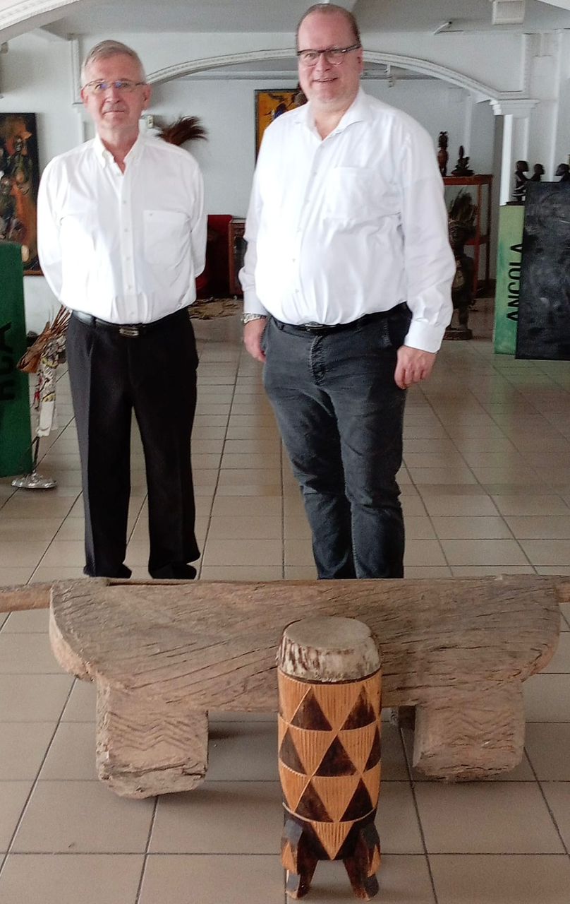 Juste après l’enregistrement de leur message groupé, Ralf Sesselberg et le Dr Hans Peter Muller ont visité la galerie abritant les œuvres artistiques du Bassin du Congo dans les locaux des Dépêches de Brazzaville.