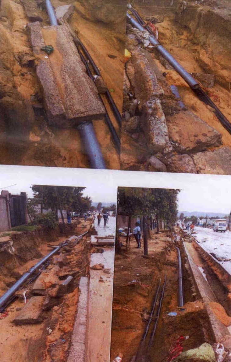 De l’autre côté de la route, la conduite en PVC DN 200 mm posée récemment par la société SADE a subi de graves avaries. Il s’agit notamment de la chute du caniveau en béton armé sur les tuyaux. Un autre endroit endommagé : le tronçon station de reprise d’Itatolo-réservoir de Soprogi. Ici, la conduite de refoulement en fonte DN 900 mm posée par l’entreprise SMEC a subi aussi un grave préjudice à hauteur d’un coude. « À cet endroit, l’érosion provoquée par l’écoulement de l’eau de pluie a été telle un canyon. La butée béton qui sert à maintenir le coude en place se trouve donc aujourd’hui en suspension au-dessus du vide et menace de tomber au fond de la tranchée et d’entraîner le coude avec elle. »