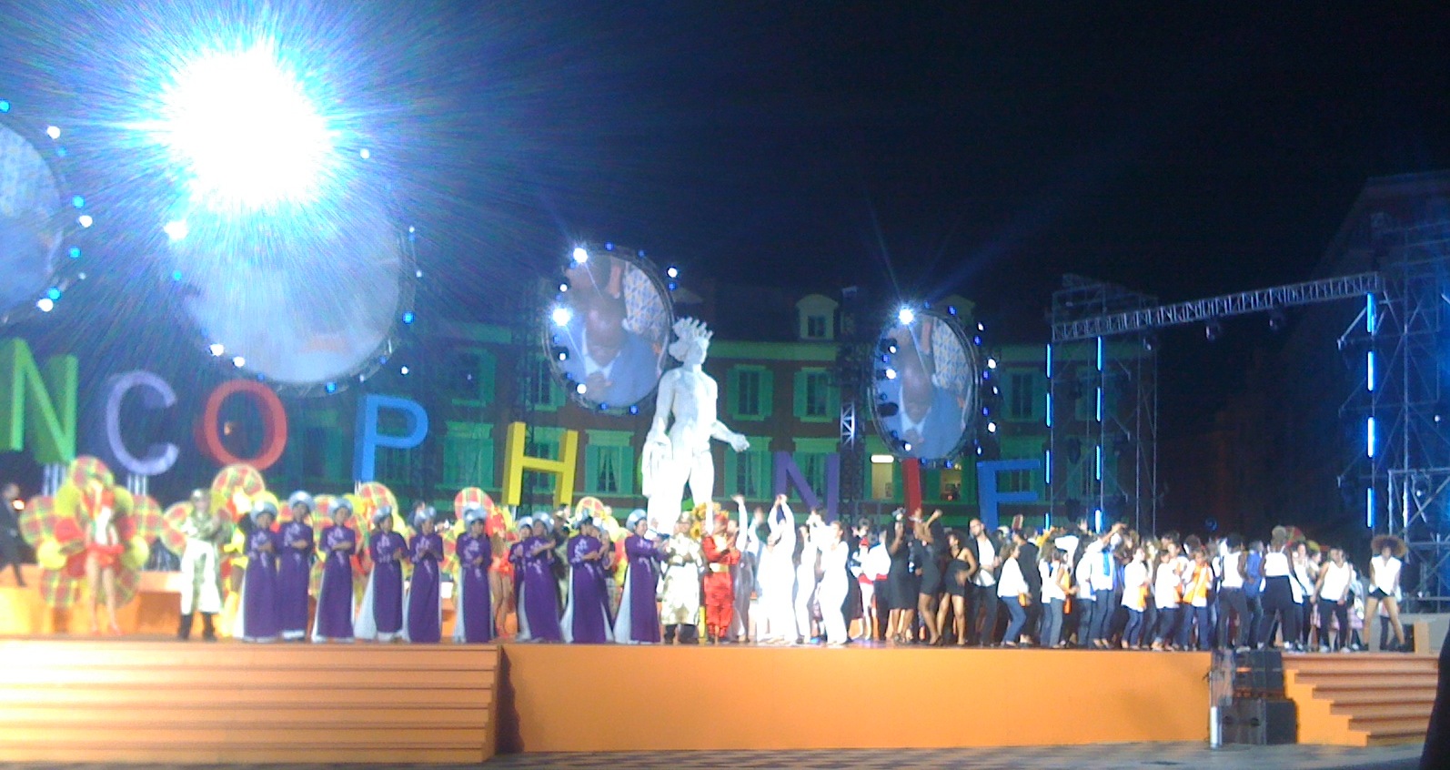 Avec comme fil rouge La Mer, la chanson de Charles Trenet interprétée par Patricia Kaas pour l'Europe, Isabelle Boulay pour l'Amérique du Nord, les collectifs Vietnam et Siapo pour l'Asie et l'Océanie, Manu Dibango, représentant l’Afrique, a été le premier à faire monter l’ambiance de sa présence chaleureuse, accompagné de percussions endiablées. Enfin, dans un final plein d’énergie et de joie communicative, Magic System a entraîné le public dans la danse, clôturant la cérémonie avec énergie et enthousiasme en lançant une invitation générale pour les jeux de 2017 qu’accueillera la Côte d’Ivoire. En bord de mer, la fête s’est poursuivie par un feu d’artifice et un karaoké géant.