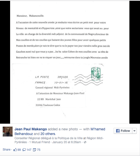 Jusqu'au mois de mars, j'étais adjoint au Maire à la ville de Toulouse et donc plus exposé à ce genre de pratiques. J'avais reçu, comme d'autres collègues, des lettres critiquant mon travail, ce qui est légitime, mais à leur différence, je recevais également des courriers attaquant mes origines. Là, il s'agit de la première lettre que je reçois à la région.