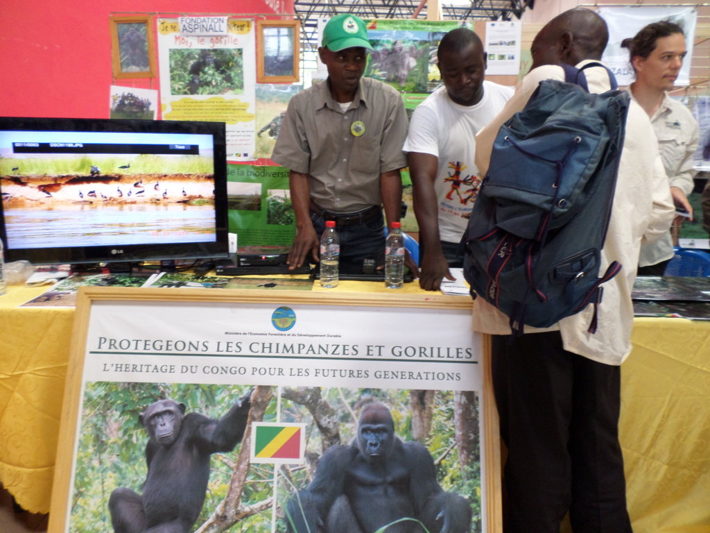 Enfin, nous terminons notre visite devant l’exposition de l’ONG The ASPINALL foundation, spécialisée dans le développement local en périphérie de la réserve naturelle de gorilles de Lésio-Louna. En dehors du Congo, aucun n’a réussi le projet de préservation des réserves naturelles, en assurant l’insertion et la protection des gorilles dans leur milieu naturel. Ce projet de soixante mois, a coûté quelque 1,084, 845 euros, soit 700 millions de francs CFA. Il a permis l’implantation de micro-projets : 80 ha de forêts communautaires plantées, 20 ha d'arbres fruitiers, 2 ha de culture maraichère, installation de trois ruchers…