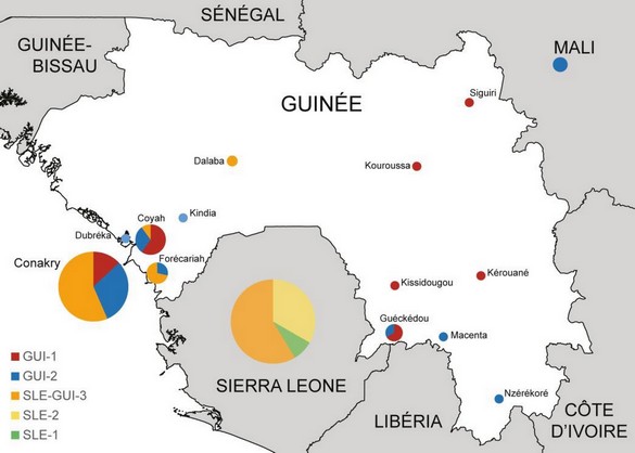 Le premier variant (GUI-1) est très proche des premiers échantillons datant du début de l’épidémie (mars 2014). Il se retrouve uniquement en Guinée, à la fois dans les régions urbaines et les régions forestières. Le deuxième (GUI-2) présente un lien de parenté avec des virus circulant en Sierra Leone mais pourrait correspondre à des virus ayant évolué parallèlement en Guinée. Ces séquences représentent le chaînon manquant ayant mené aux deux introductions d’Ebola au Mali, en octobre et novembre 2014.