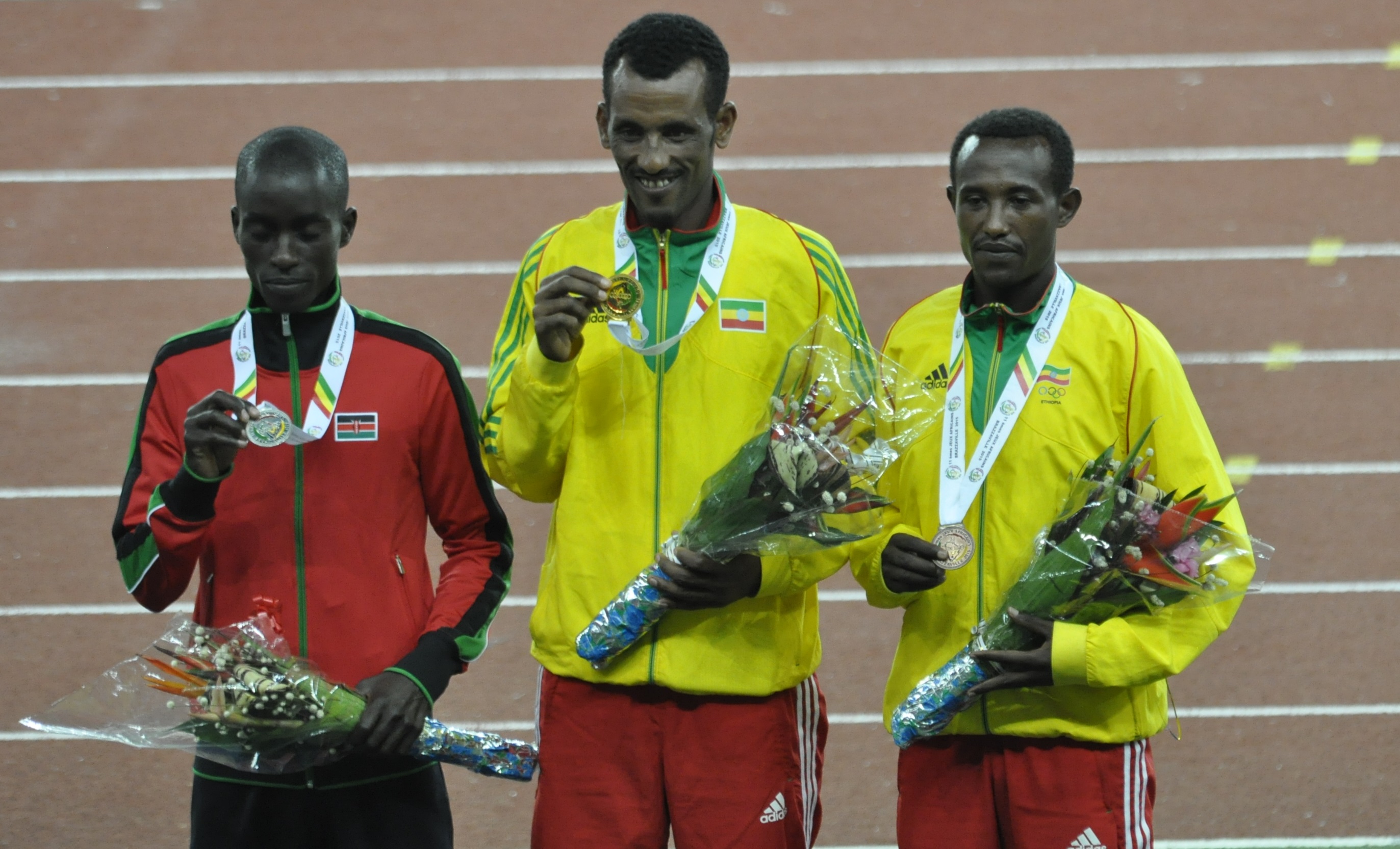 Si le Kenya s’est emparé de l’or sur le 10. 000 mètres féminin, c’est l’Ethiopie qui s’était imposée, le 14 septembre, lors de l’épreuve masculine. Tsebelu Zewude a parcouru les 25 tours de piste en 27.27.19, suivi du Kenyan Leonard Barsoton (27.27.55) et de l’Ethiopien Adugna Takele (27.28.40). Si les trois hommes se sont rapprochés du record des Jeux, obtenu par l’Erythréen Tadese à Alger (27.00.30), mais restent très loin du record d’Afrique et du monde de Kenenisa Bekele (26.17.53 à Bruxelles en 2005).