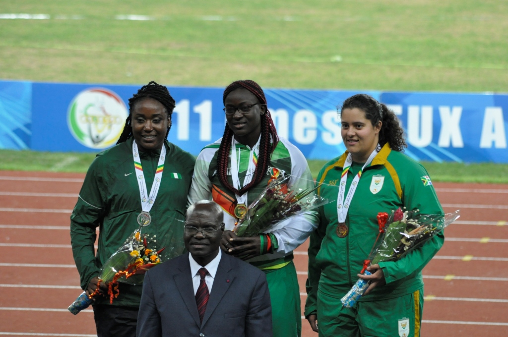 Entraînée par le Marocain Mohamed Fatihi, coach de Franck Elemba, la Camerounaise Auriole Dongmo a eu le dernier mot au lancer de poids. Sa première tentative sera finalement la bonne avec un lancer à 17m21, nouveau record du Cameroun à la clé. La Nigériane Claire Uke suit sur le podium avec tout de même 57 centimètres de moins. La Sud-Africaine Sonia Smuts est troisième avec 15m92.