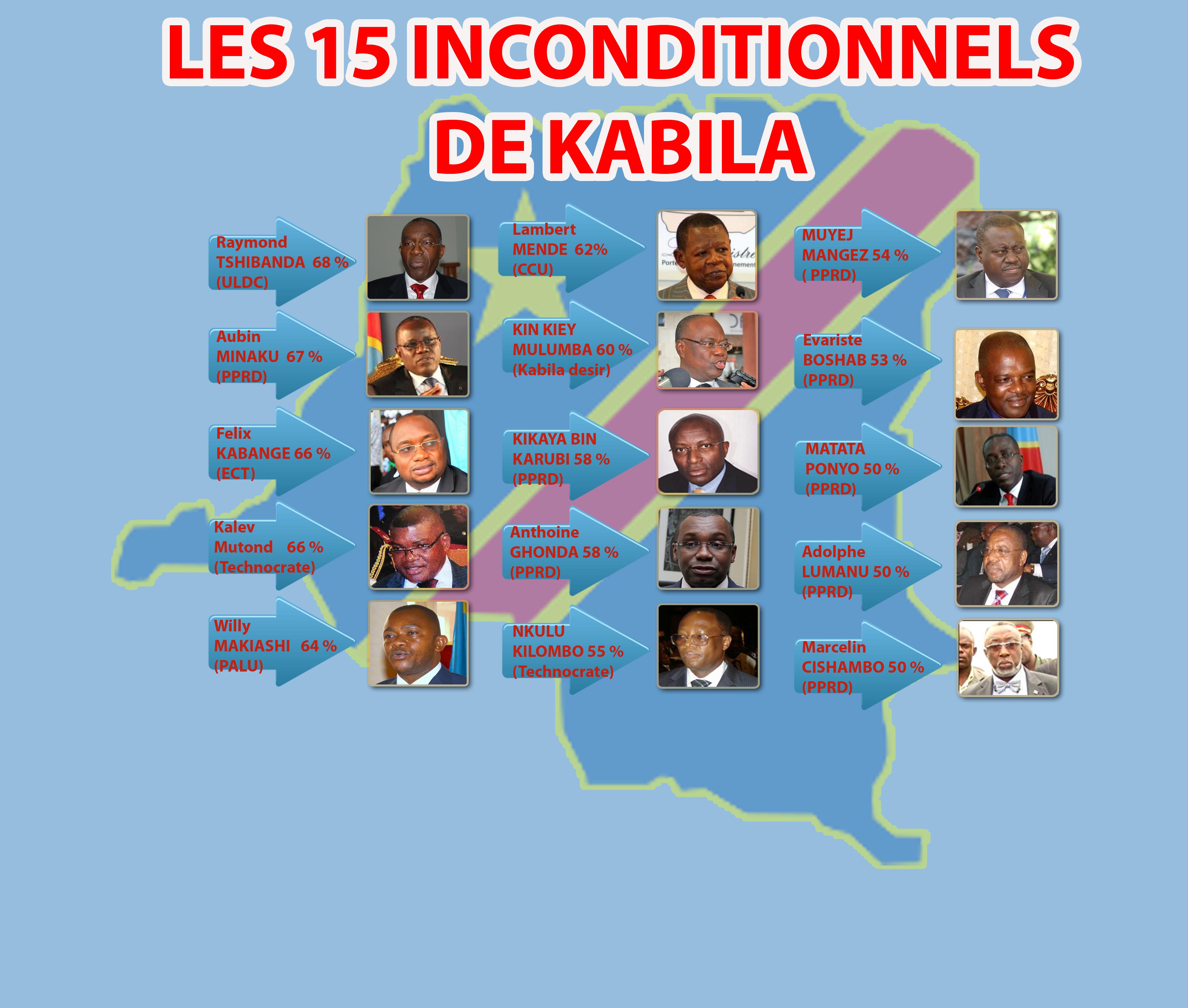L'enquête d’opinion, réalisée par Les Points du 17 au 18 sept à Kinshasa, a relevé que globalement, sur les quinze inconditionnels de Kabila, huit sont membres du Parti du peuple pour la reconstruction et la démocratie (PPRD); deux technocrates alors que l’ULDC; le Palu; le CCU; l’ECT et Kabila désir se partagent les cinq restants.