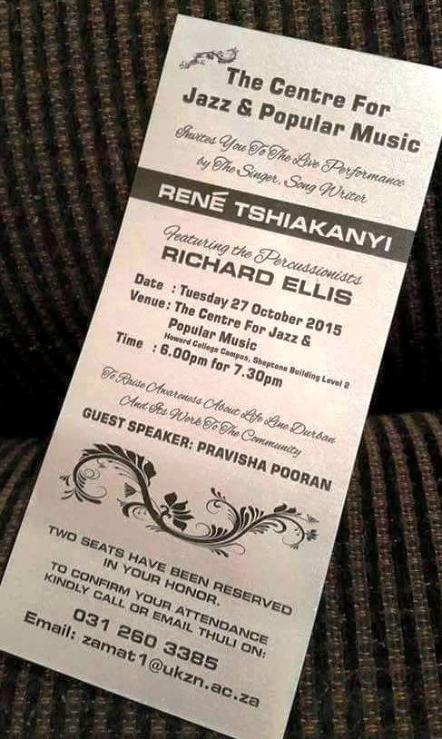 Le musicien RD-congolais se produit en fait dans le cadre d’une tournée en Afrique du Sud, à la suite de sa désignation en juin 2015 comme ambassadeur par « Life Line Durban », une branche de l’Organisation australienne pour la prévention des suicides dans le monde. Le Centre de Jazz et de musique de l’Université de Kwazulu Natal est donc la première scène d’une série des concerts que René Tshiakanyi va livrer dans quelques villes sud-africaines.