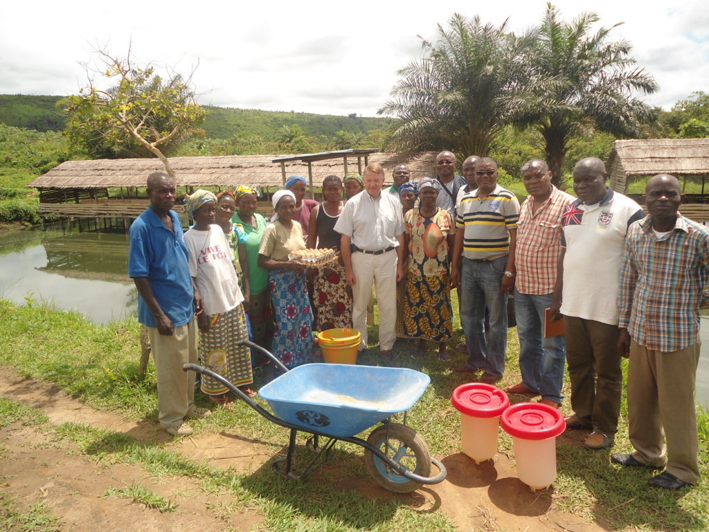 Ides de Willebois s’est ensuite rendu à la station piscicole de Mbondo, à Kinkala, chef-lieu du Pool. Là-bas, le Proder appuie un groupement de femmes dans la pisciculture et l’élevage des pondeuses. Ce projet est cofinancé avec le Programme des Nations unies pour le développement (Pnud). Dans son périple, accompagné d’une délégation du Proder 3 (intervenant dans les départements de la Likouala, Sangha et Pool), il s’est arrêté à la ceinture maraichère de la coopérative des femmes maraichères de Kinkala. À cet endroit les femmes ont relevé la difficulté qu’elles éprouvent durant la saison sèche, car elles manquent d’eau. Elles ont besoin d’une aide financière pour rendre disponible un câble électrique en faveur de leur activité champêtre.