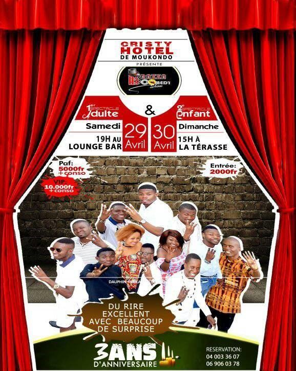 Pour lier l’utile à l’agréable, les humoristes congolais vont offrir un grand spectacle pour leurs 3 ans, qui se déroulera les 29 et 30 avril 2017 à Christy hôtel de Moukondo. Le spectacle du 29 avril est destiné aux adultes à partir de 19h, et celui du 30 avril reservé aux enfants à partir de 15h avec beaucoup de cadeaux. L’objectif étant de faire rire les Congolais. Ils invitent toutes les personnes qui n'ont jamais vues le rire en live de venir voir, Junior de Mat, Weilfar Kaya, Kimana formidable, Djaust Pounga, Aristote Kaya (cerveau magique), Juste Parfait, God Zek, Yann Mounouata, Princilia Lyne, Beranger Loundou, Naz-R, Charles Mohamed, Rose Digitale et Roblin Ngatali, l'artiste qui imite le chef de l’Etat. D’autres anciens de ce groupe seront également présents à la cérémonie. C’est un événement à ne pas rater.