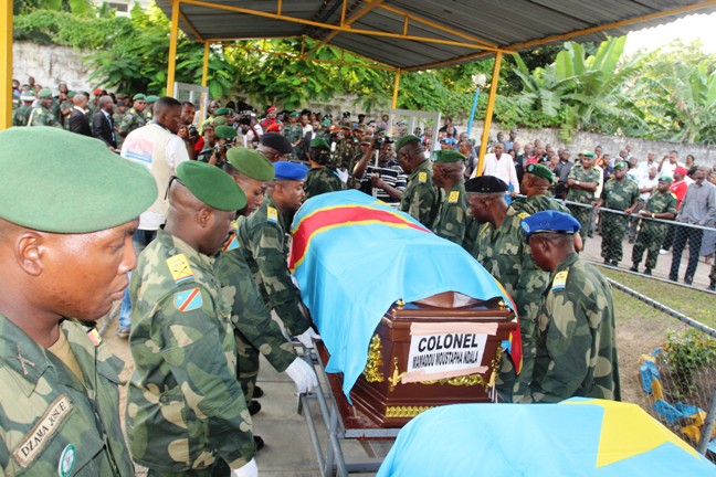 La ville de Kinshasa et la République tout entière a rendu, le 6 janvier, un dernier hommage au colonel Mamadou Moustafa Ndala, tué avec ses deux gardes du corps, le 2 janvier à Beni (Nord-Kivu). Plusieurs Kinois ont fait le déplacement du camp Kokolo où étaient exposés les corps des trois officiers, mais aussi de sept autres militaires tués dans la foulée des évènements du 30 décembre 2013 à Kinshasa, Lubumbashi, Kolwezi et Kindu. L’atmosphère était des plus triste. Des amis et connaissances ont afflué sur le site pour témoigner sa compassion à l’endroit du disparu et de sa famille biologique. Gerbes de fleurs, cantiques religieux et prières ont meublé cette journée. Des hommes en armes, officiers, sous-officiers tout comme des soldats de rangs ont pleuré celui qui fut un de leurs à chaudes larmes.