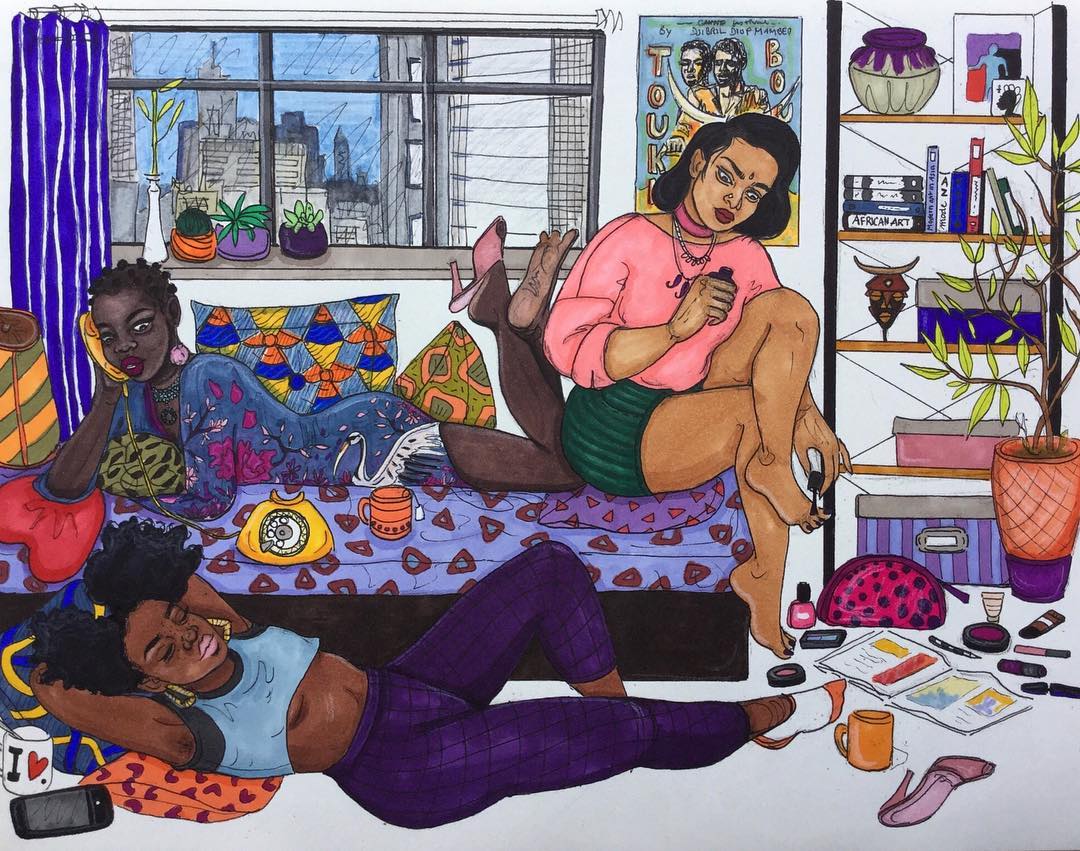 En foulard et jeans, aux cheveux courts, tressés ou rasé, ses dessins présentent les femmes noires sous ses formes : fines ou voluptueuses, percées ou tatouées, souffrant d’albinisme ou de vitiligo, noires ou métisses… Sur les tableaux, des tissus wax, des statuettes en bois, batiks, plantes et diverses couleurs ont bien planté le décor inspiré de l’Afrique.