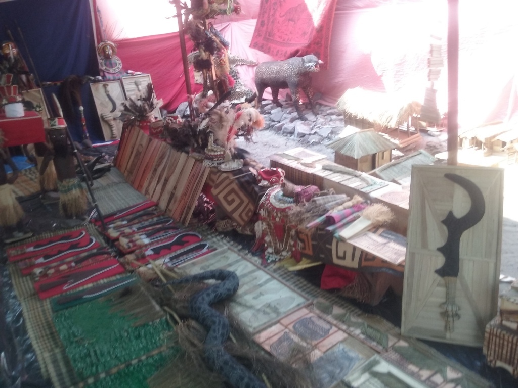 Plusieurs objets traditionnels ont été exposés, à savoir : couteaux, cannes traditionnelles pour les notables et chefs coutumiers, le balai traditionnel pour trancher les problèmes qui se passent dans les foyers, le bâton de commandement, porte-monnaie ou corvée « Otwere », les noix de cola, les lianes de chasse, les nasses, le panier pour mettre le manioc, la hache du notable, la queue du buffle, les petites cases traditionnelles, les chapeaux, la pirogue pour poursuivre les animaux aquatiques, la carte de la République du Congo avec un couteau, les instruments de musique, les tortues à base desquelles l’artiste a fabriqué les Sanzas, le calendrier Mbochi de 28 jours, la panthère, l’éléphant, le boa ou python…