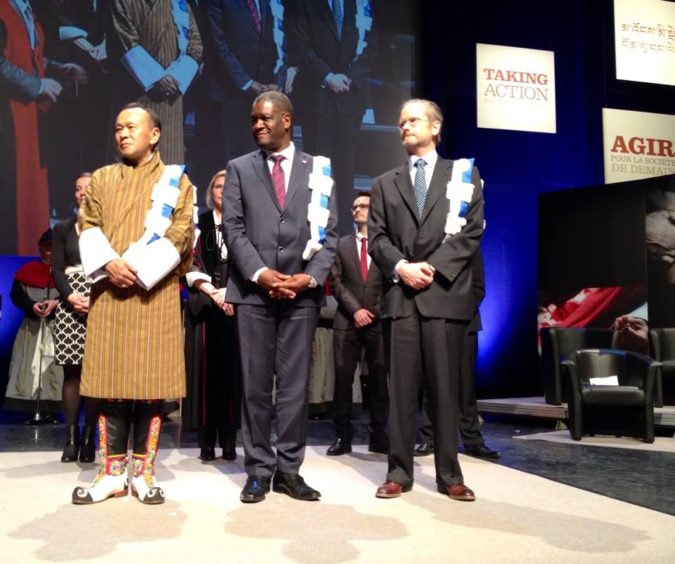 Deux autres lauréats ont reçu le titre de doctor honoris causa en compagnie de Dr Mukwege. Le premier président élu démocratiquement au Bhoutan, Jigmi Thinley travaille actuellement avec l’ONU pour définir un nouveau paradigme de développement, basé non plus sur le produit intérieur brut et la compétition comme moteurs de croissance économique, mais sur un « bonheur intérieur brut » reposant sur la satisfaction des besoins physiques et intellectuels de l'être humain et répondant aux crises sociétales actuelles. Pour sa part, le Pr Lawrence Lessig est un juriste américain de notoriété internationale et un spécialiste de la propriété intellectuelle. Il travaille depuis plusieurs années sur les groupes de pression et les lobbies qui pèsent sur les politiques menées par les gouvernements, aux Etats-Unis notamment, et qui remettent en question certains principes de fonctionnement de la démocratie