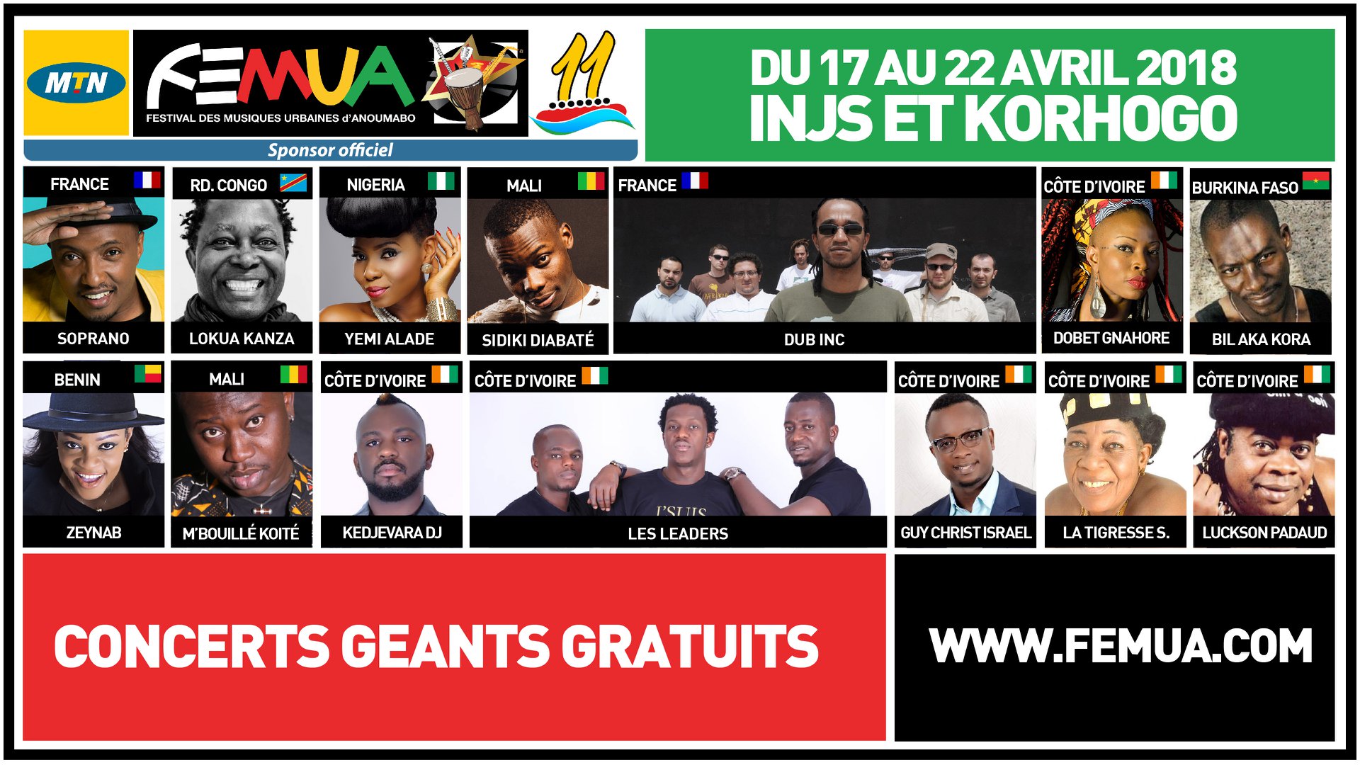 Voici, entre autres, les artistes qui presteront lors de cette édition : les Français Soprano et Dub INC, la Nigériane Yemi Alade, le Congolais Lokua Kanza, les Maliens Sidiki Diabaté et M’Bouille Koité, le Burkinabé Bil Aka Kora et la Béninoise Zeynab. Au plan local, Dobet Gnahoré, Kedjevara, Les Leaders, Guy Christ Israel, Sidonie La Tigresse et Luckson Padaud représenteront les divers genres musicaux de la Côte d’ivoire.